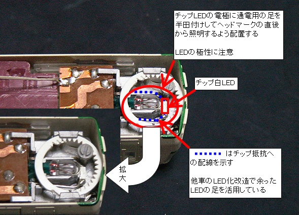(左上) 従来からのユニット基板内にチップ抵抗を追加するだけなのでユニット本体を構成している各パーツの加工は不要です (右上) 画像では見えませんが緑色の小形基板への給電は画像基準で緑色基板の右端から延ばす配線でライトユニット基板の端子 (茶色基板の右端から延びる2本の線) に直結させています ブリッジダイオードは両波整流を行なう素子で走行方向にかかわらず電流が一方向に流れるようにする整流回路で、スイッチングダイオード4個を用いての自作も可能です 画像には 『428』 の刻印がありますが、これは部品として最初に採用されたであろうクハ481の品番(当時)で485系のみならずかなりあちこちで使いまわされている部品のようです (左下) ヘッドライトは電球、ヘッドマークは白LEDで点灯させるとこんな感じです 増設した小形基板の上には何も無いので組み立てに際しては特に問題は発生していません |