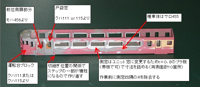 <クハ455-500番台> 種車の車体にクハ115の運転台ブロックを接合します。 画像は捻出した部品の関係で前位の側扉部分も切り継ぎを行っていますが、種車体にクハの運転台ブロックを直接接合する場合はこの作業は不要です。 戸袋窓はオリジナルのクハ455とは異なり幅の狭いタイプを使用します。 実車のトイレ側の妻面には改造銘板1枚が追加されているので、タヴァサの楕円形製造銘板(PX1471) を使用して追加します。 |