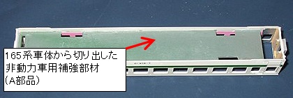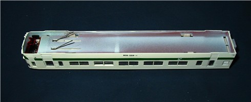 ← モハ485用の床板を使用してクモハ455用に改造中 右端の妻板部はカプラー腕の短い台車に合うよう現物合わせで切り詰める 左端の先頭部は車体の折妻形状に合わせて整形する (寸法は切り詰めない) 画像は機器類を全て撤去し出来た孔を全て埋め、パテを塗り鉄ヤスリで荒削りの後サンドペーパーで仕上げた状態である |