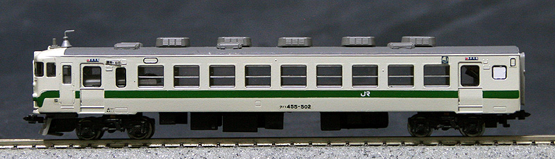 上は昭和43年に登場した冷房準備車仕様の後期形(モハ454-37〜51)、下は新製時非冷房で落成した初期形(モハ454-1〜36)です。 モハ456は製品のまま(通風器は4個)です。 |