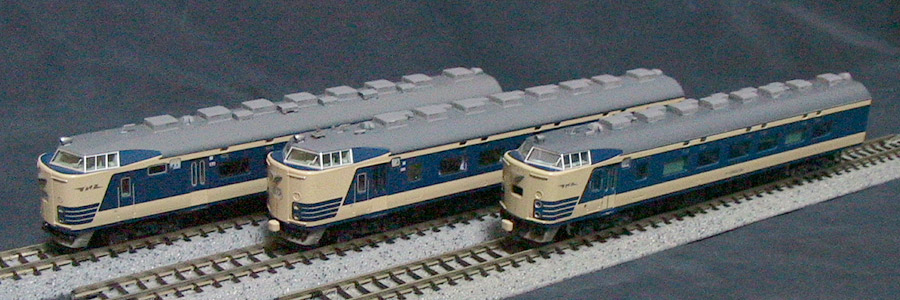 | 全車共通の改造(変更)点 1.Hゴムを全て黒に変更 2.屋根は一旦全体をグレー(ねずみ色1号)に塗装後、塗屋根化 3.クハネのJNRマークを撤去し、JRマークを追加 4.中間の貫通扉はステンレス地を表現するためメタリックテープにて表現 5.床下に汚物循環処理装置と洗面所の排水管を追加 |