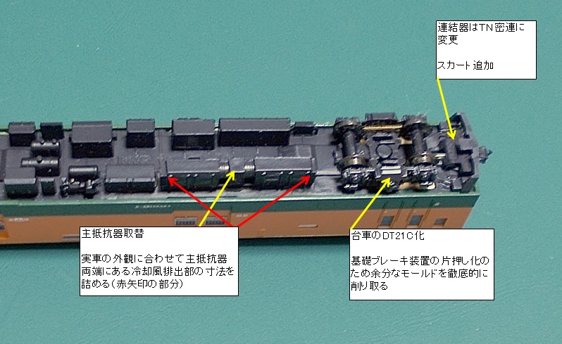 (店頭で見る限りでは品番は設定されていない)を使用し、寸法を詰めて使用しています。それ以外にもCPの形状や配置が実車と異なるわけですが、床下一式はヘッドライトスイッチが内蔵されているタイプでこれ以上弄ると不調になりそうな感じ(?)なので主抵抗器を取り替えた以外はそのままにしています。